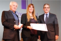 La reunión se realizó el 29 de noviembre de 2012, ante dos centenares de personas. En la foto el P. Ballarini, presidente del Foro, da la distinción a BBVA Francés, a Sandra Busquets y Gonzalo Verdomar Weiss.